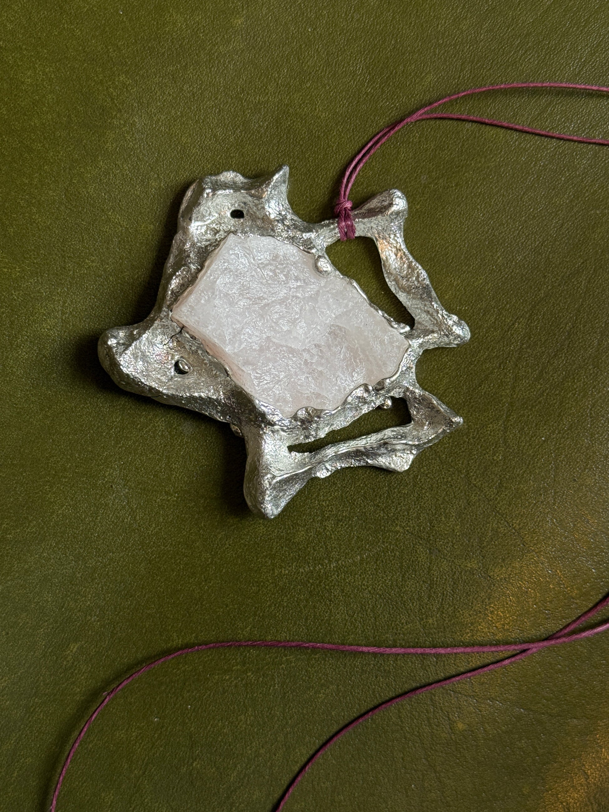 Handcrafted in recycled swedish tinn, with an embedded rose quartz stone. Ribbon is waxed cotton.
