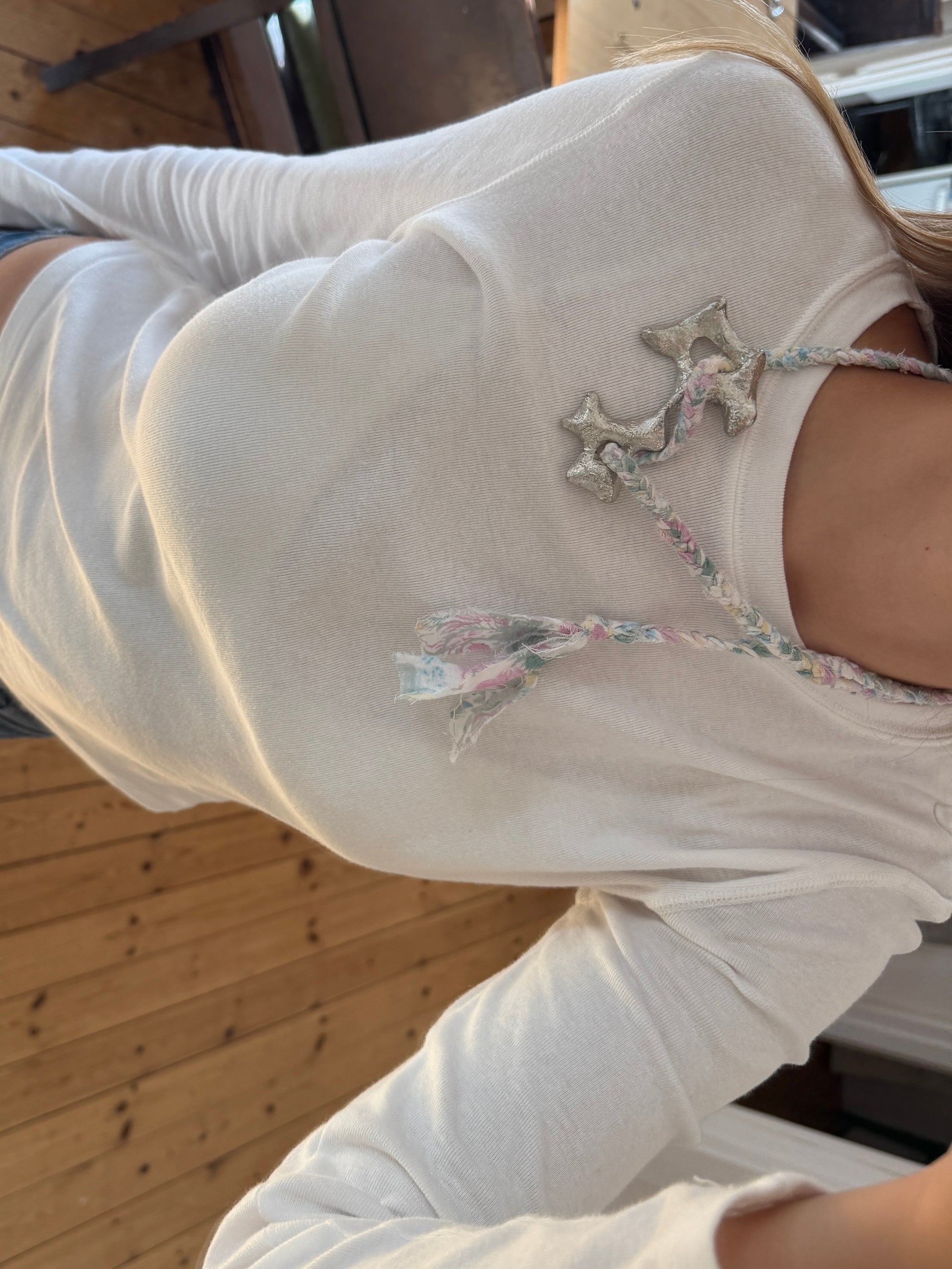 Handcrafted in recycled swedish tinn, braided recycled textile as ribbon.