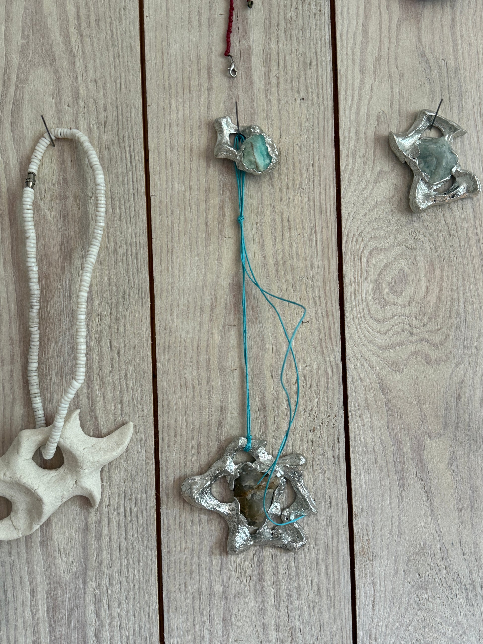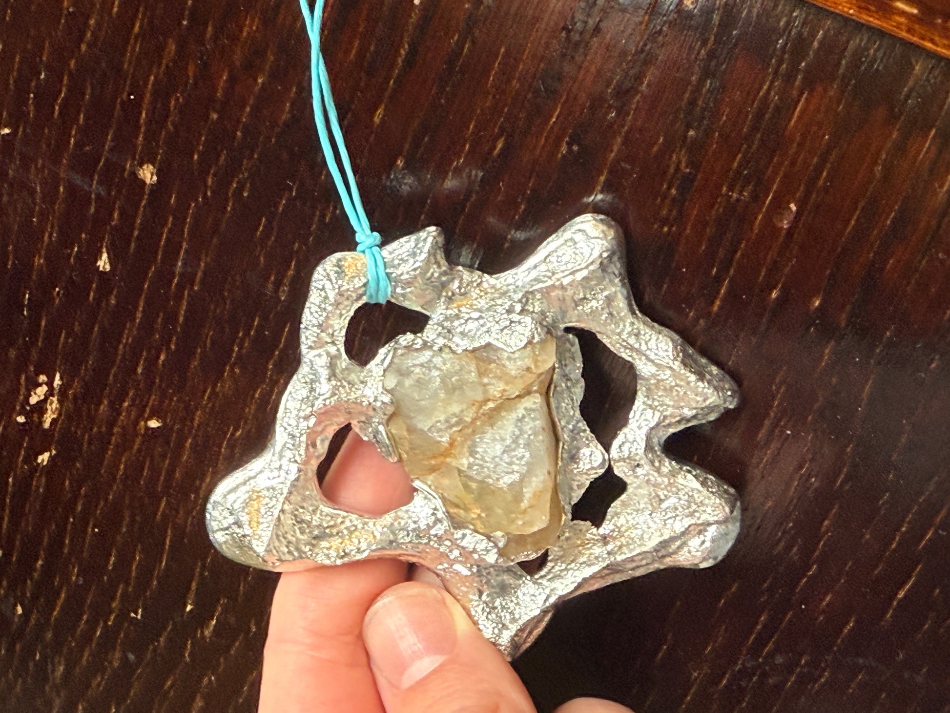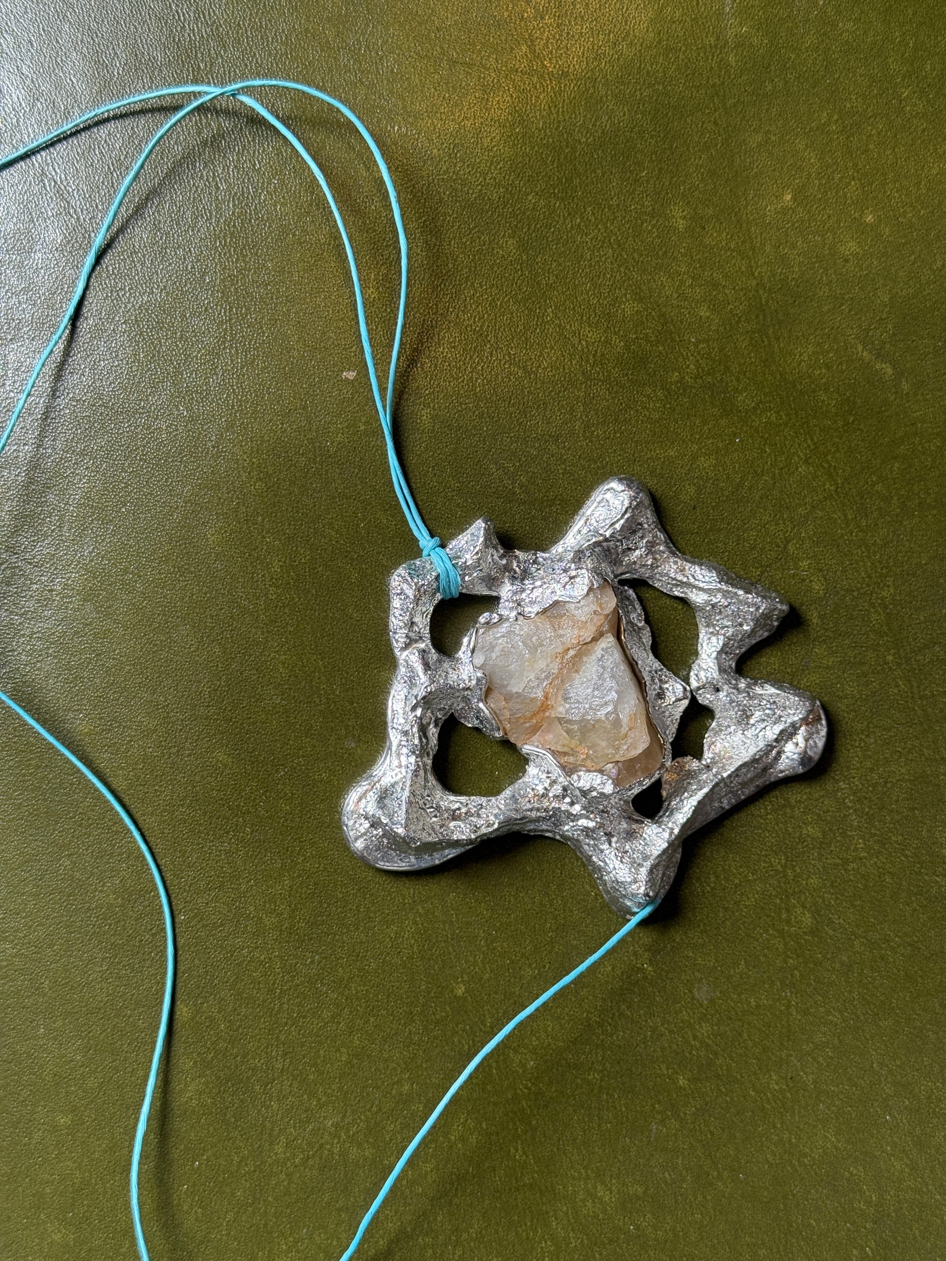 Handcrafted in recycled swedish tinn, with an embedded stone. Ribbon is waxed cotton.